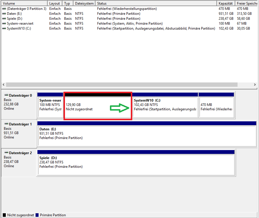 Normalerweise sollte dies kein Problem sein, jedoch, da Windows 7 vor Windows 10 installiert war, ist die Partition vor der Windows 10 Partition. Es ist mir so daher nicht möglich den eigentlich feien Speicher zu nutzen um die Windows 10 Partition zu vergrößern (ist im Kontextmenü ausgegraut).