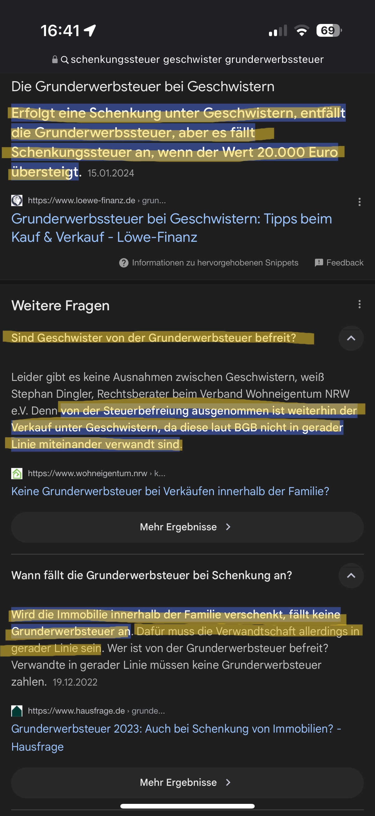 Leider widerspricht sich hier auch meine Suche im Netz. Einmal wird behauptet, dass bei Schenkungen GRUNDSÄTZLICH keine Doppelbesteuerung erfolgt, andere Seiten spucken aus, dass das nur gilt, wenn man "in gerader Linie" miteinander verwandt ist (Eltern, Kinder, Enkel, etc) - siehe dazu Screenshot der Google-Suche.
