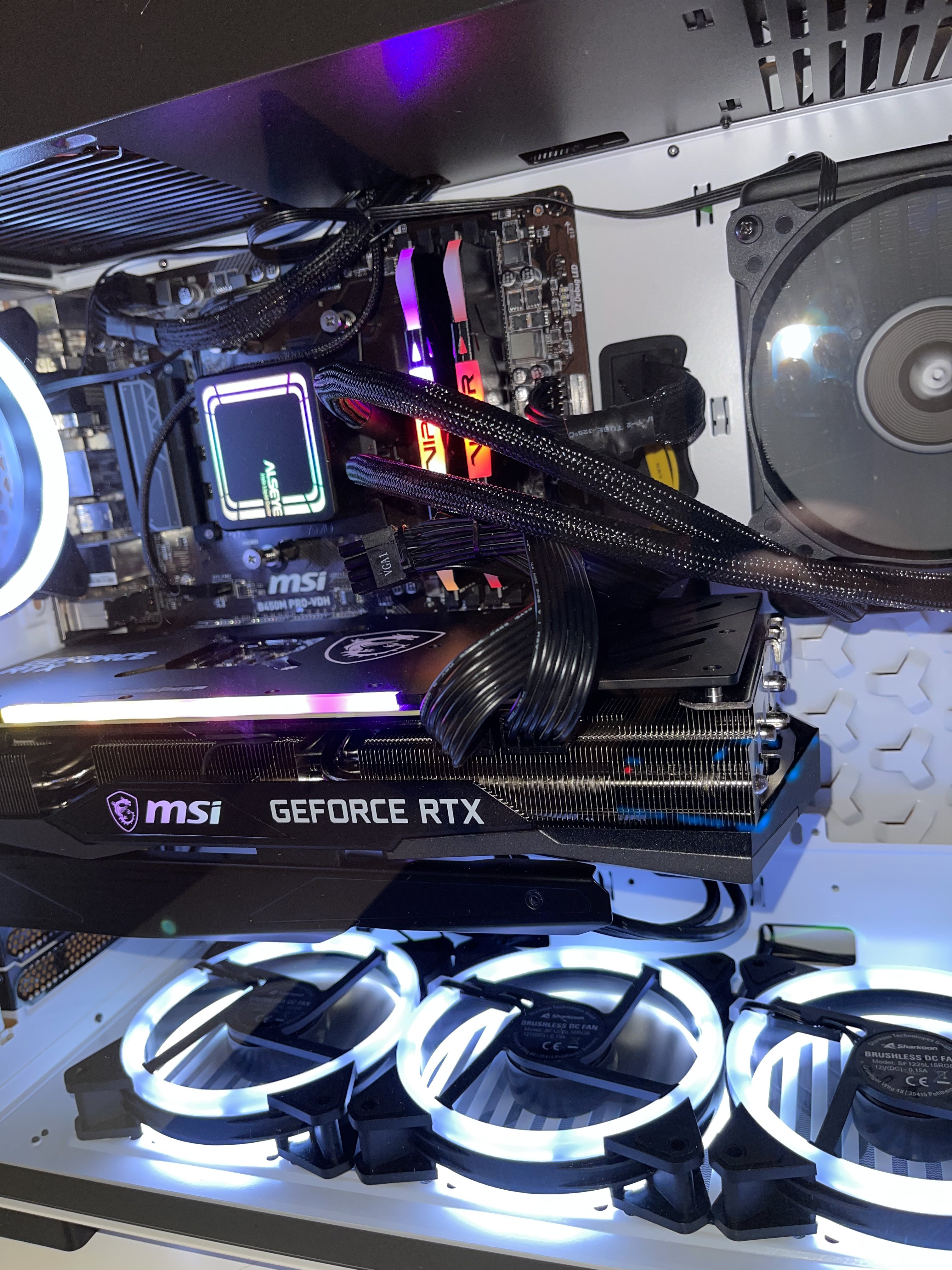 Es kann bei dieser Montageart des Radiators, besonders wenn die Schläuche oben sind zu "gluckern" kommen. Dort sammelt sich die Luft und erzeugt dann Geräusche wenn die AiO in Betrieb ist. Es hilft in diesem Fall häufig einfach den Radiator zu drehen, das die Schläuche unten sind. Deshalb wird diese Art empfohlen, wenn der Radiator hinten bzw. vorne installiert wird.