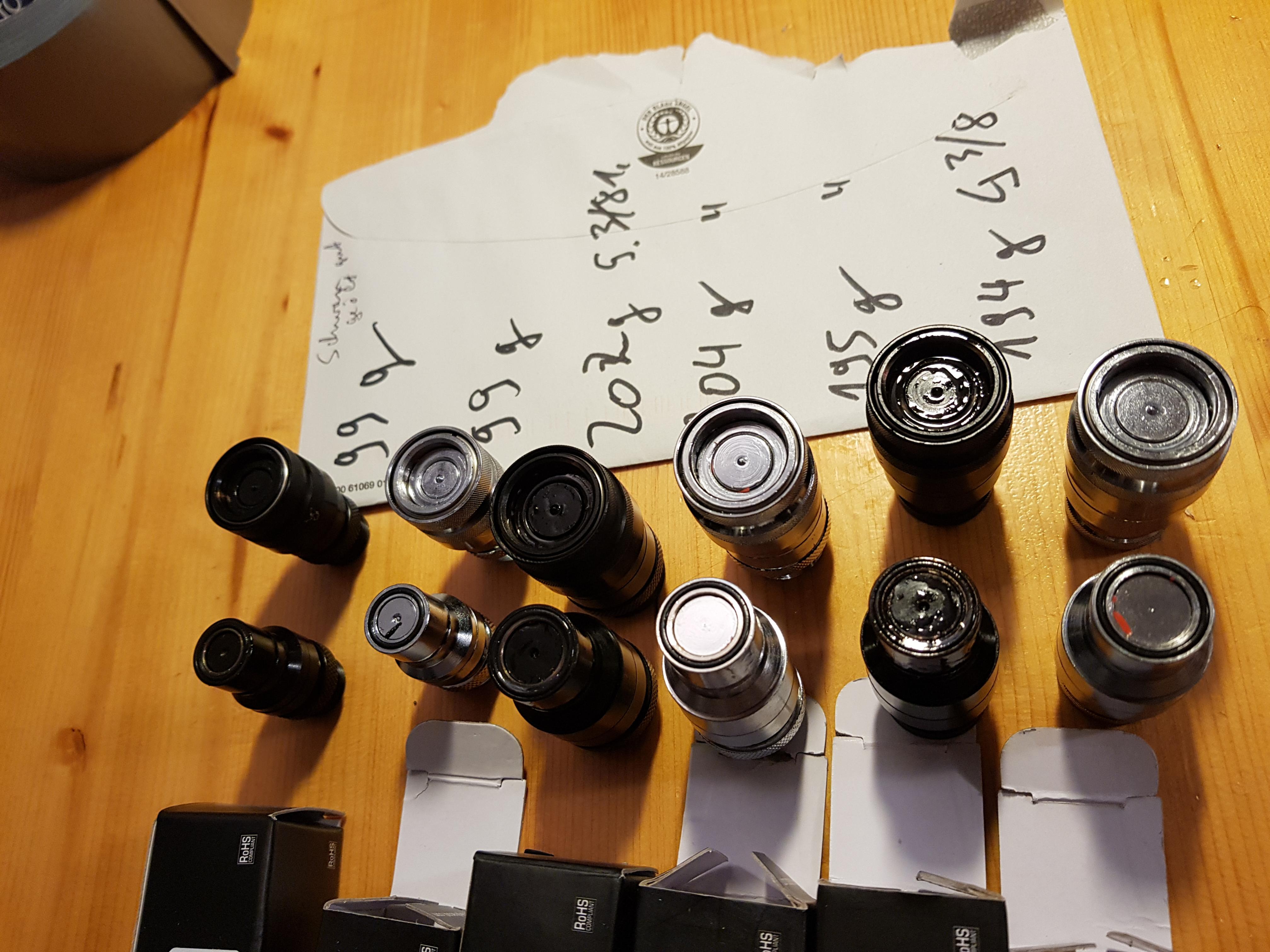 Die G3/8 und G1/4 Teile der Reihe nach von unten nach oben: (Alphacoll Eiszapfen mit ALC E abgekürzt)