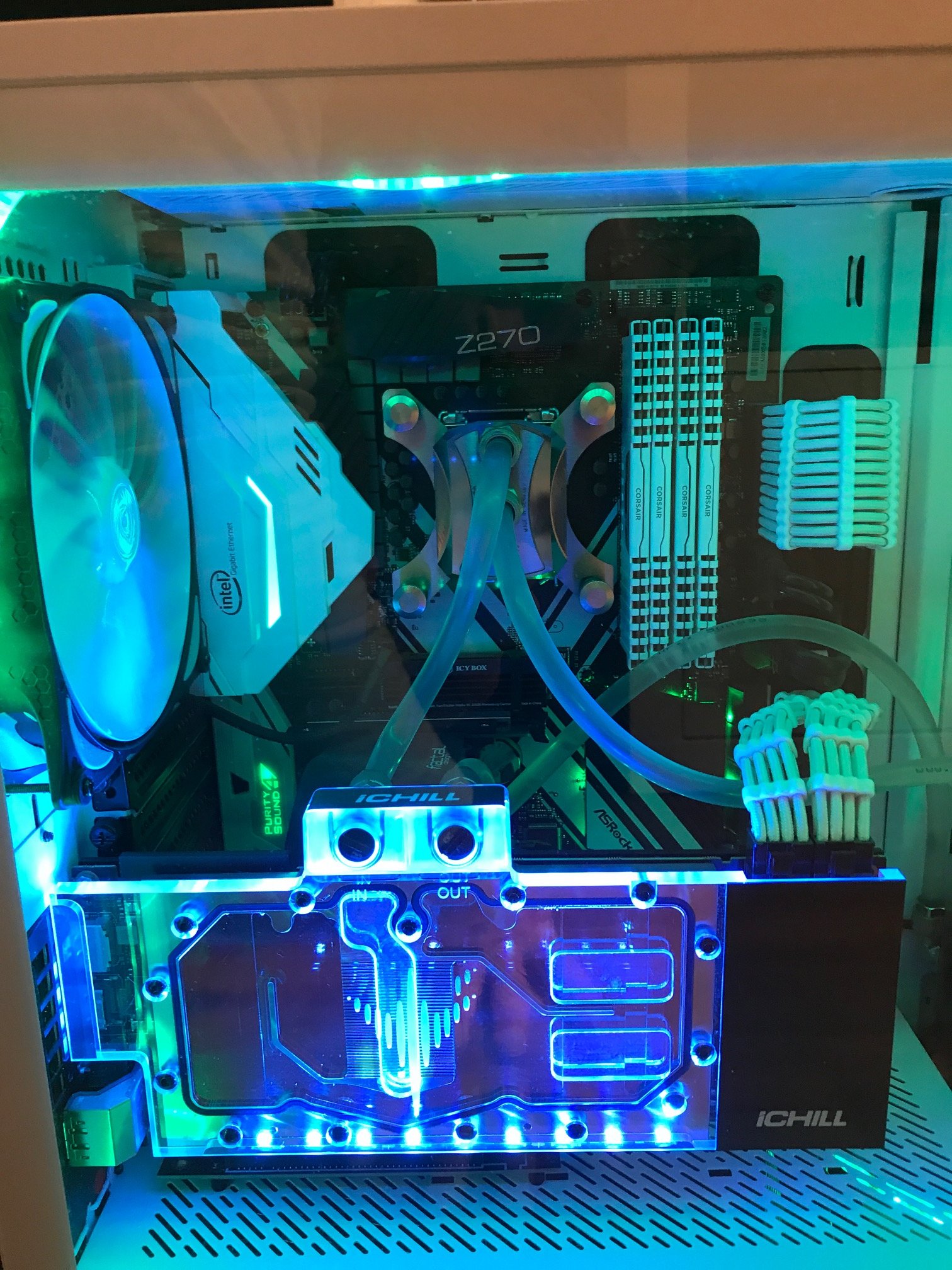 Die CPU läuft unter einen Cyros und die 2080TI ist Stock WaKü mit OC. Pumpe ist die Aquastream Ultimate.