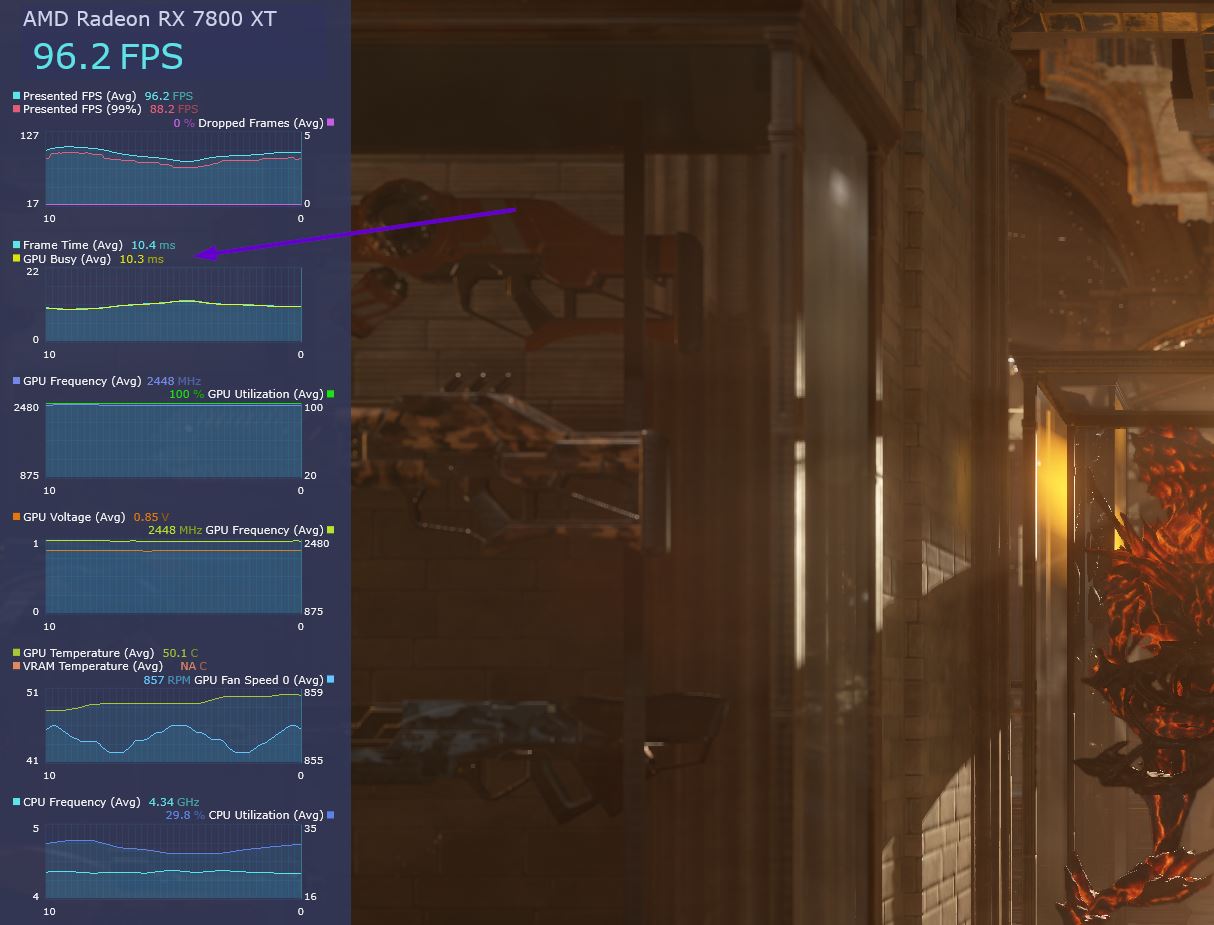 In einem rein GPU-limitierten Benchmark sollte GPU Busy nur minimal kleiner sein als die Frametime, wenn da häufig oder dauerhaft deutliche Lücken sind, hakt es irgendwo davor.