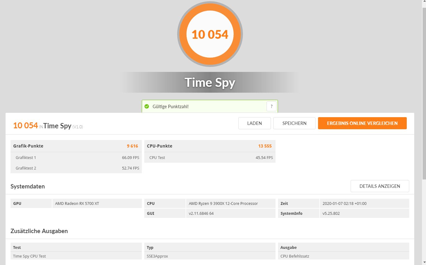 Meine XT Karte kommt auf 10.054 Punkte, leicht hoch getaktet. Es kommt doch auch immer auf die eingesetzte CPU mit an. Wie man sieht, heimst die CPU bei mir und TimeSpy deutlich mehr Punkte ein, als die GPU.