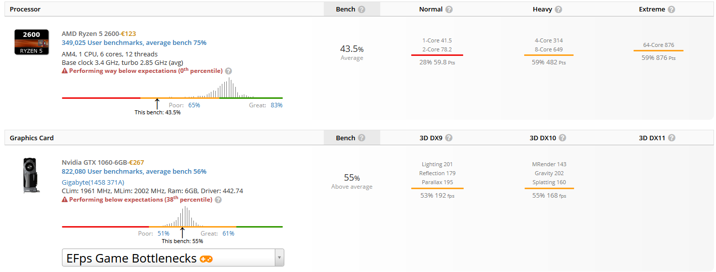 So nun zu meinem Problem, ich merke seit kurzem, dass ich zwischendurch echt ziemliche Leistungseinbusen habe und mein Userbenchmark-Test ist auch viel schlechter ausgefallen als früher(habe leider keine Ahnung in wie weit ich solchen Tests vertrauen kann), weiß hier vielleicht jemand woran das liegen könnte und mit welchen Tools ich es dann verbessern oder überprüfen könnte.