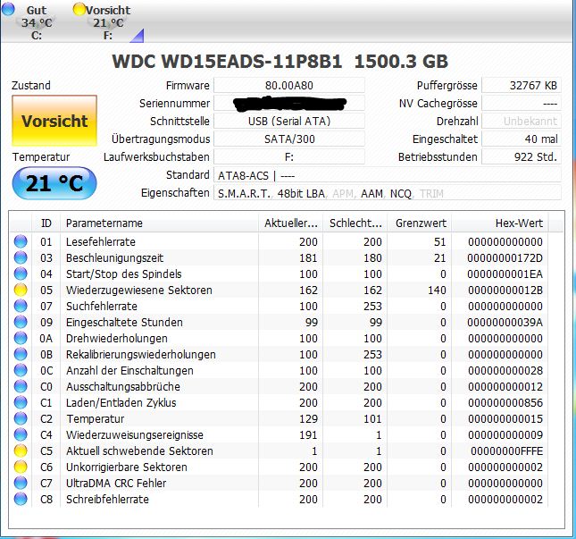 Als ich mir gestern mit Crystal Disk Info die SMART-Werte ausgelesen habe, wurde mir unter "Zustand" -Vorsicht angezeigt (siehe auch Screenshot)