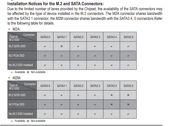 Installation Notices for the M.2 and SATA Connectors Due to the limited number of lanes provided by the Chipset, the availability of the SATA connectors may be affected by the type of device installed in the M.2 connectors. The M2A connector shares bandwidth with the SATA3 1 connector; the M2M connector shares bandwidth with the SATA3 4, 5 connectors.Refer to the following table for details.