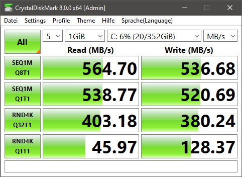C Ich bin überhaupt überrascht, dass sie auf 561MB lesend kommt....so viel schafft meine Sata Schnittstelle nicht...bei mir ist knapp über 500 schluss.