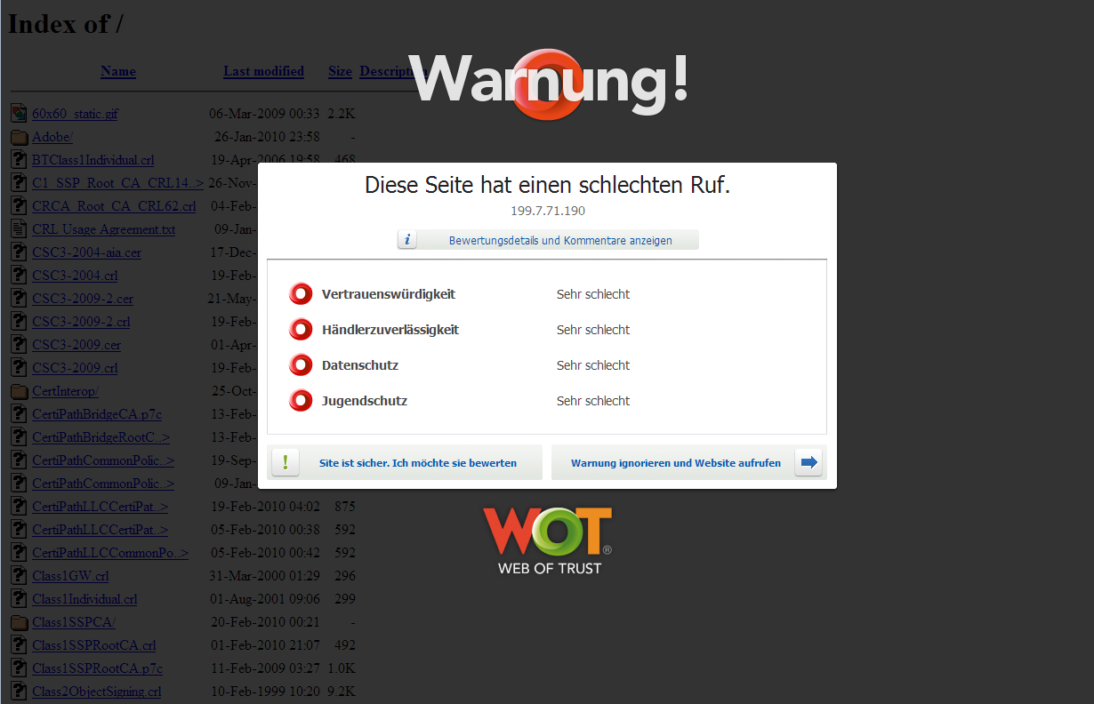 Ich vermute mal, dass die WoT-Bewertung von einem einzigen erschreckten User gemacht wurde, der durch irgendeinen Link auf die Seite kam (z.B. in einem Forum über digitale Zertifikate oder so) (bzw. die IP-Adresse eingegeben hat, nachdem er sie im Firewall-Log oder sonstwo gesehen hat) und konnte sich aus den Dateien auf dem Server keinen Reim machen und hat sie deswegen schlecht bewertet. Hast du dir mal die "Bewertungsdetails und Kommentare" angesehen? Ich wette, dass das nur ein User bewertet hat.