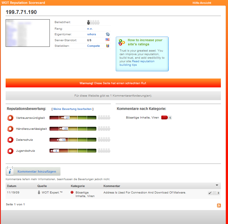 Mich wundert es nur, das einer so eine Mist-Bewertung abgibt, oder ob auf der Seite wirklich etwas ist. Weiter geöffent habe ich die Seite noch nicht nur bis zur WOT Meldung. Die IP habe ich in der W7 Firewall mal geblockt. Mal weiter schauen.