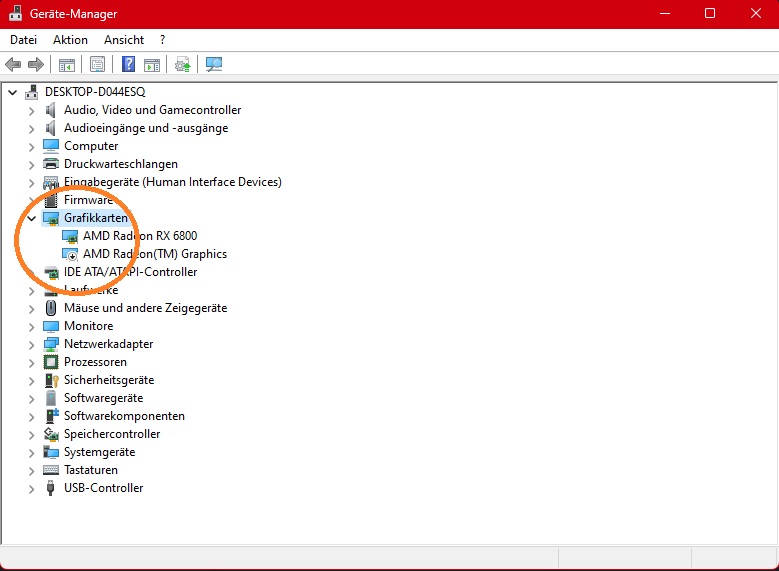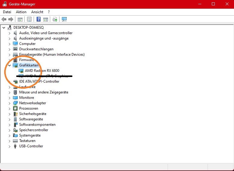 Dieser Pfeil-nach-unten bei 'AMD Radeon(TM) Graphics' bedeutet, dass die interne Grafikkarte nicht genutzt wird, sondern die dazu gesteckte RX 6800.