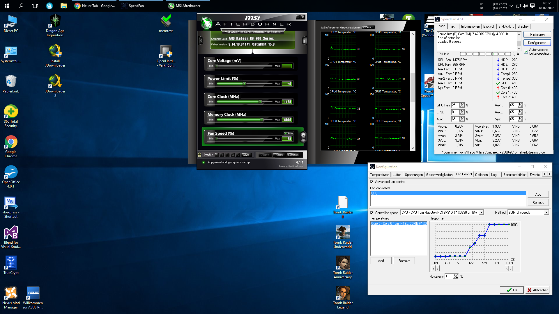 Ausserdem zeigt Speedfan mir auch keine korrekten Umdrehungszahlen für die Lüfter an, wahrscheinlich, weil es zwei verschiedene sind.Er zeigt immer die selben Umdrehungszahlen.