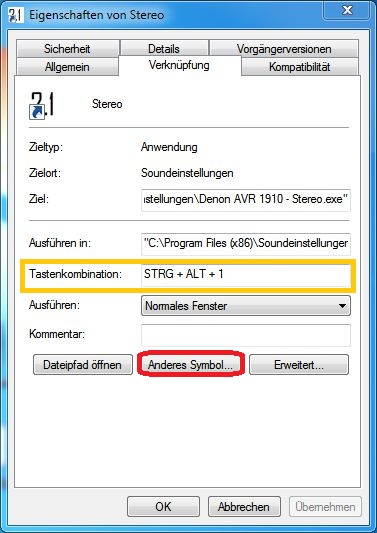 In dem geöffneten Fenster kann nun einmal die gewünschte Tastenkombination eingegeben werden, sowie ein eigenes Icon gewählt werden, um das Shortcut optisch aufzuwerten: