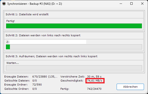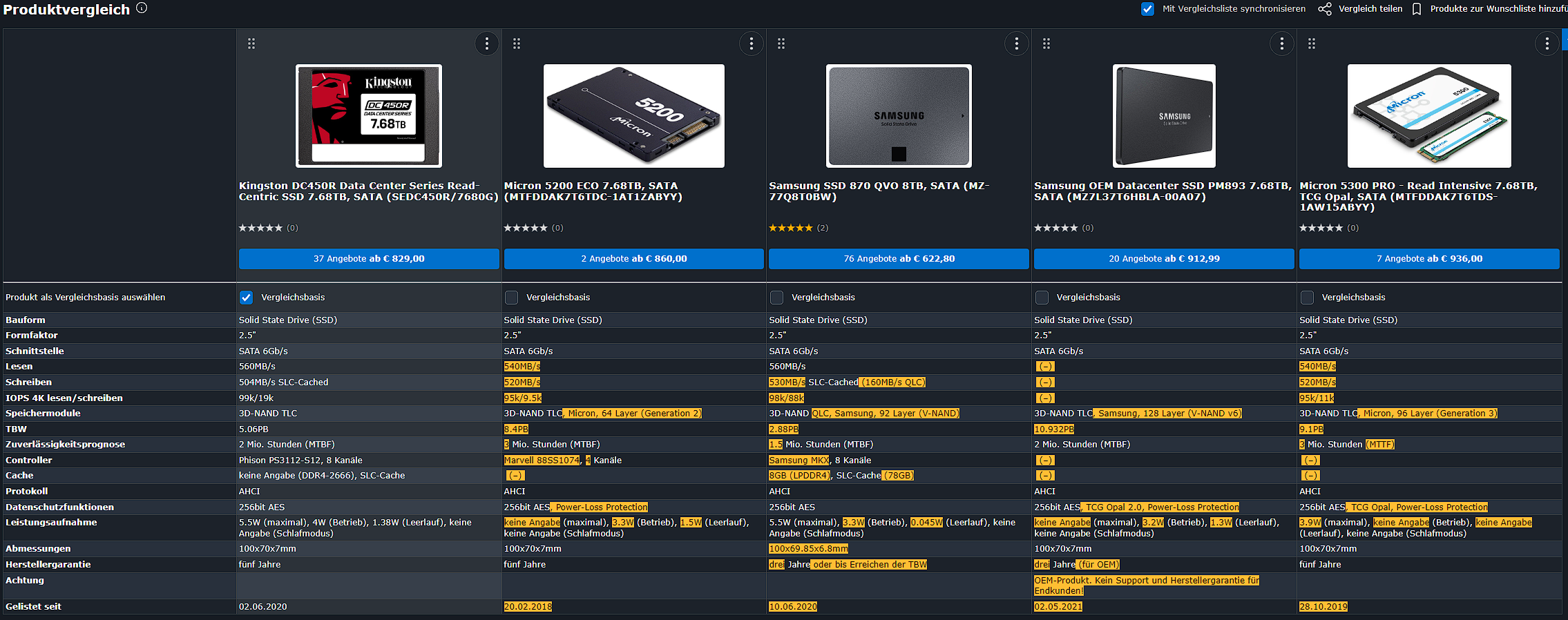 Ich backupe auf meinen Rechner von einer sehr großen Samsung-Server-SSD auf eine zweite sehr große Micron-Server-SSD, von dieser auf eine ebenfalls im Rechner verbaute HDD sowie auf ein NAS. Das Problem: Das NAS braucht ständig Stunden um die tausende von Dateien zum Vergleich einzulesen (!) und später dann auch zu schreiben. Meine Idee: Die zwei Cache-SSDs aus dem NAS heraus rupfen und zwei 7.68TB SSDs im RAID1 einbauen. Was ist davon zu halten, wie wird die zu erwartende Performance sein? Ich denke, das RAID5 aus HDDs des NAS ist von den IOPS her zu limitiert, weswegen der Stunden am rumzuckeln ist. Was von SSD zu SSD normalerweise nur wenige Minuten dauert. Ich habe mir ein paar SATA-SSDs angeschaut, welche davon wäre empfehlenswert? Persönlich würde ich wegen der TBW und dem TLC 128 Layer-NAND 2x zur 912 Euro teuren Samsung Datacenter SSD PM983 7.68TB tendieren.