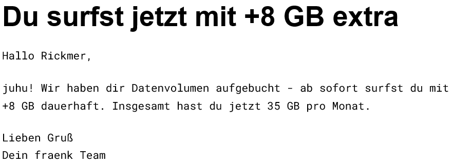 Auslöser ist, dass ich vorhin eine Rundmail erhalten habe, die mir mitteilt, dass es seit gestern einfach +5GB gibt... und das Datenvolumen für den Monat nebenbei auch resettet wurde.