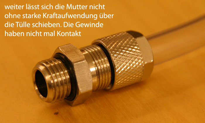 Hier mal ein paar Bilder der Verschlüsse. Auf dem zweiten sieht man, wie weit die Mutter aufgeschoben werden kann, ohne viel Kraft anzuwenden.