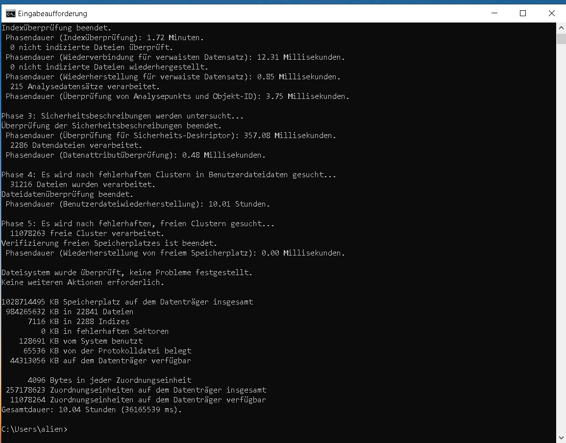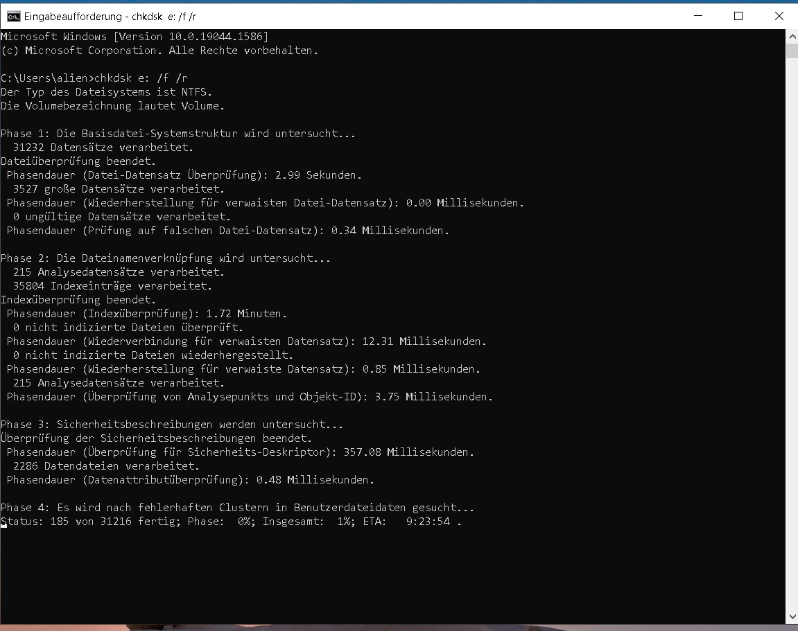 zweiter versuch mit chkdsk e: /f /r da läuft die Phase 4 noch
