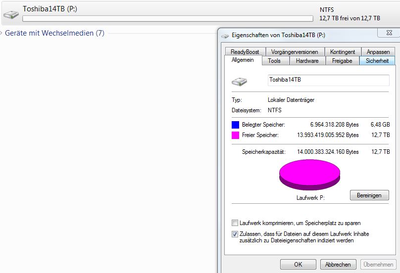 habe unlängst eine neue Toshiba 14TB Festplatte gekauft (3,5", 7200rpm, 0815 Desktop Platte halt).