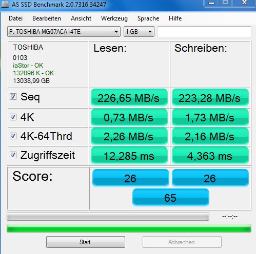 5.) Aus Spaß (bringt zwar nix) hab ich die neueste Version von CrystalDiskMark und auch den AS SSD Benchmark (der für mechanische PLatten ja eher ungeeignet ist) laufen lassen und es gab wieder Null Komma Null Probleme.