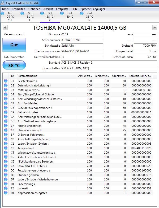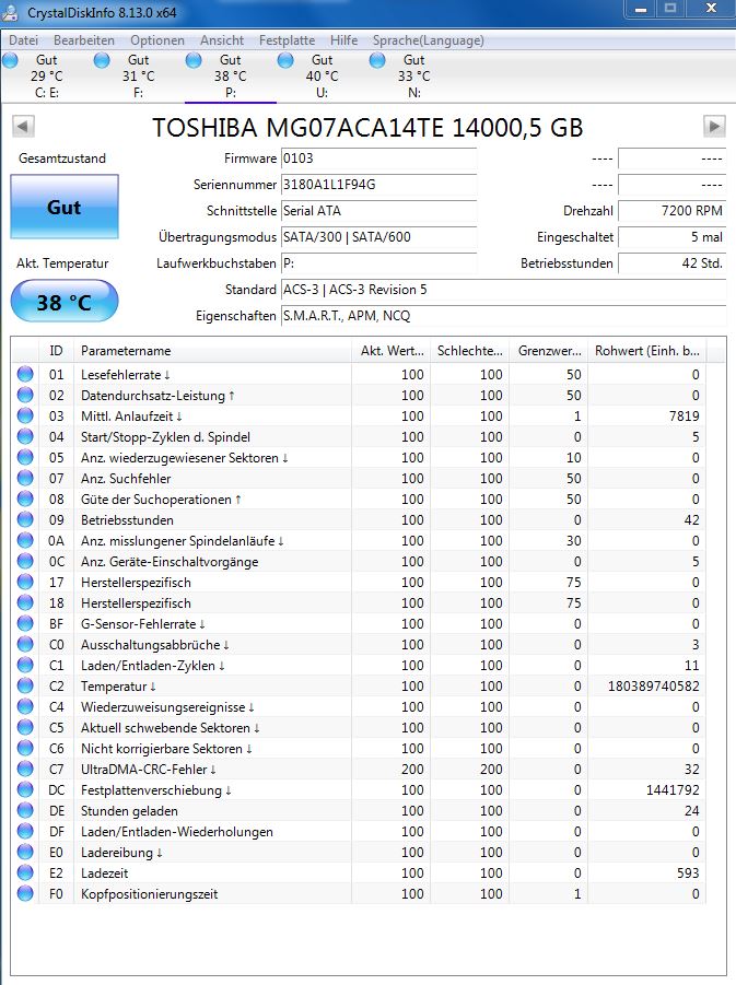 CrystalDiskInfo gecheckt: WAS!? SMART Attribut C7: 3 Stk Ultra DMA CRC Fehler!? Und das bei einer nagelneuen Platte!?