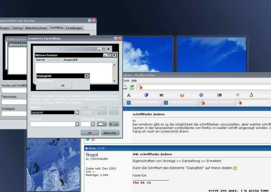 bei windows gibt es ja die möglichkeit die schriftfarben umzustellen, aber welche schriftfarbe muss ich umstellen , damit meine sachen in der lesezeichen symbolleiste von firefox in weißer schrift angezeigt werden. ich hoffe ihr versteht was ich meine, ansonsten häng ich noch en screenshot drann.
