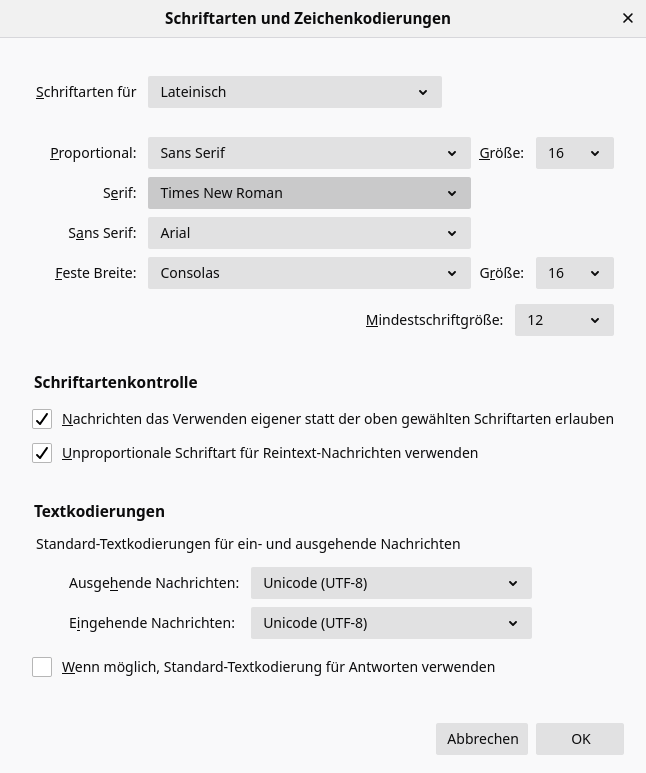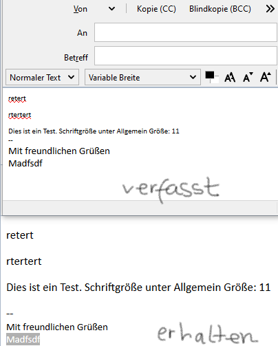ich habe Thunderbird 78 installiert und komme mit der Schriftgröße nicht ganz klar. Beim Erstellen einer neuen Mail ist die Schrift viel zu klein obwohl ich diese auf Mittel gestellt habe. Schritftart ist "Calibri". Alles unter "Einstellungen\Verfassen".