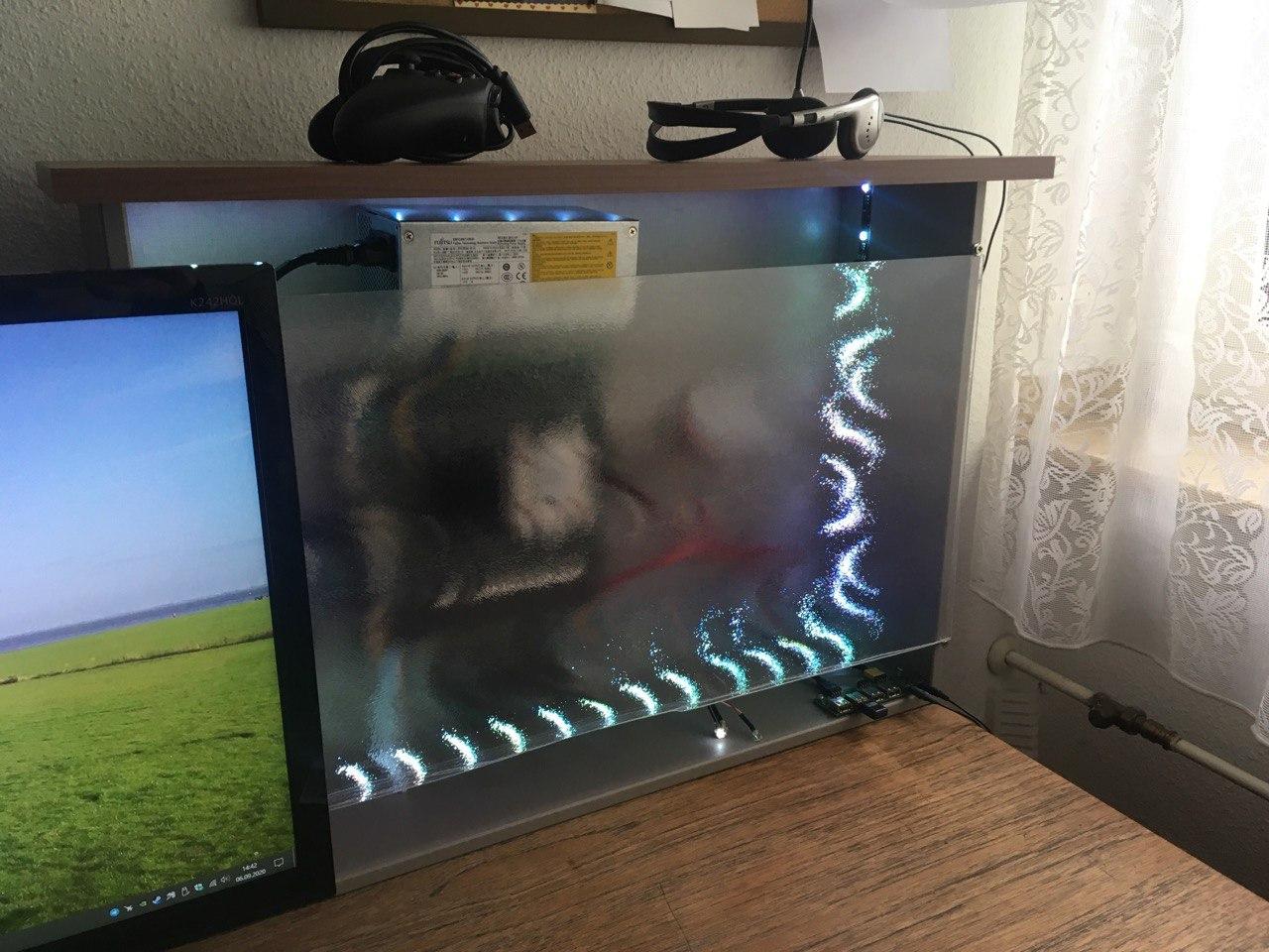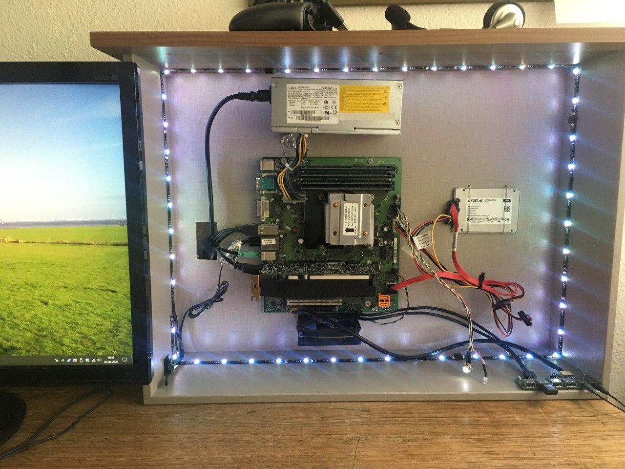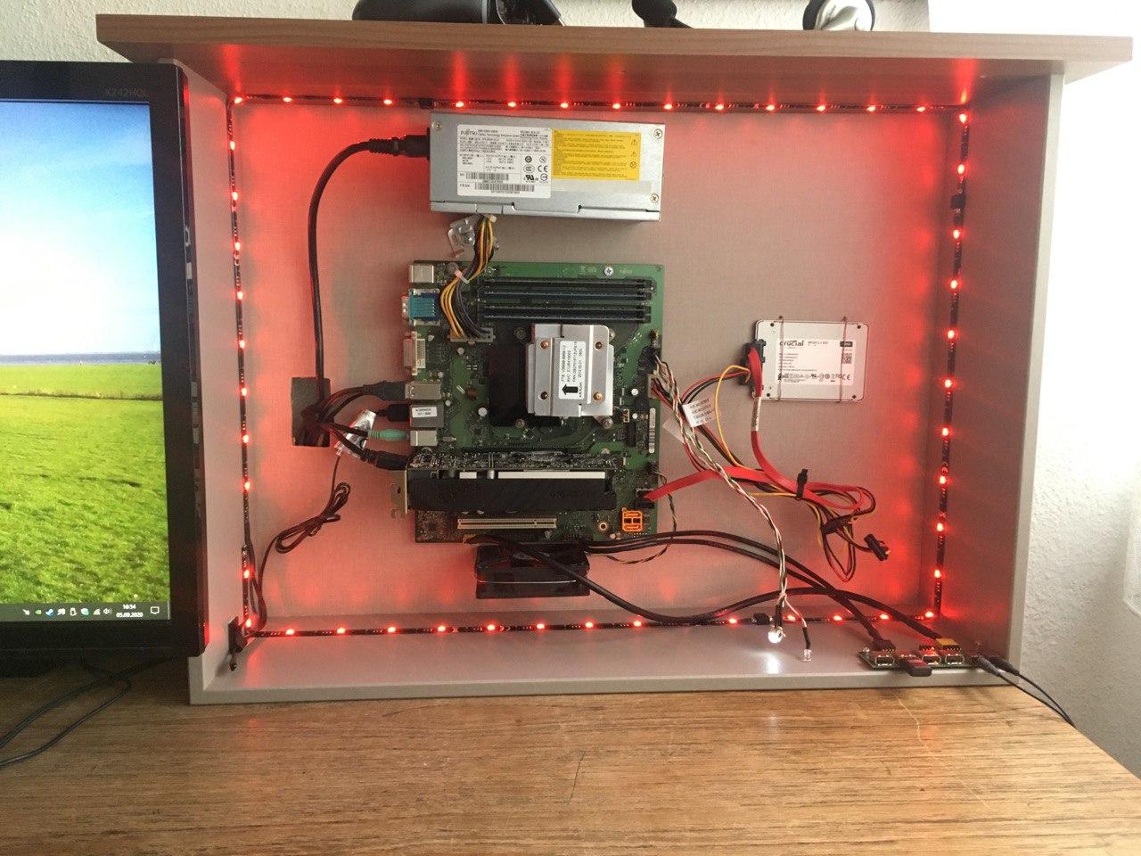 Das Ergebnis seht ihr auf den Bildern. Ist natürlich einiges was man anders, besser, hätte machen können, aber sollte ja vorallem günstig sein! In 2 Jahren kommt das ganze System neu, solange muss das halten, und dann hab ich schonmal ein nettes Basisgehäuse. Die Front wird dann komplett mit Milchglasscheibe zu und unten rechts aussen und oben dann gute Lüfter rein.