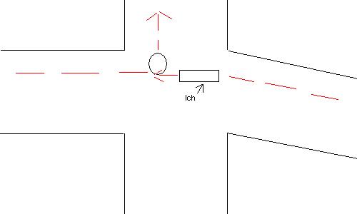 ich hatte vor rund 2 Monaten einen Autounfall, aber bis jetzt nur Stress deswegen. Mal der Herrgang, ich wollte über eine Kreuzung fahren, also fuhr ich auf die Kreuzung zu und es wurde grün, ein paar Fahrzeuge aus dem Gegenverkehr sind noch vor mir nach links abgebogen. Soweit schön und gut, doch als ich über die Kreuzung wollte, wollte ein Auto aus dem Gegenverkehr nach links, das Ende war dann, dass ich den anderen Verkehrsteilnehmer im rechten Heck erwischt habe. Wer hat jetzt schuld? Ich wollte ja die Kreuzung geradlinig überquerren, der andere Verkehrsteilnehmer war Linksabbieger. Skizze im Anhang.