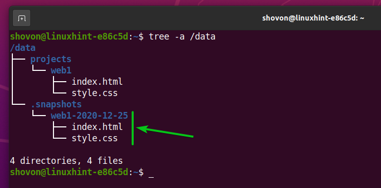 .snapshots verzeichnis verfügbar und auf die dateien kann ganz normal zugegriffen werden. das verhält sich nicht anders als wenn die daten auf einem anderen datenträger wären. siehe z.b. https://linuxhint.com/use-btrfs-snapshots/Anhänge