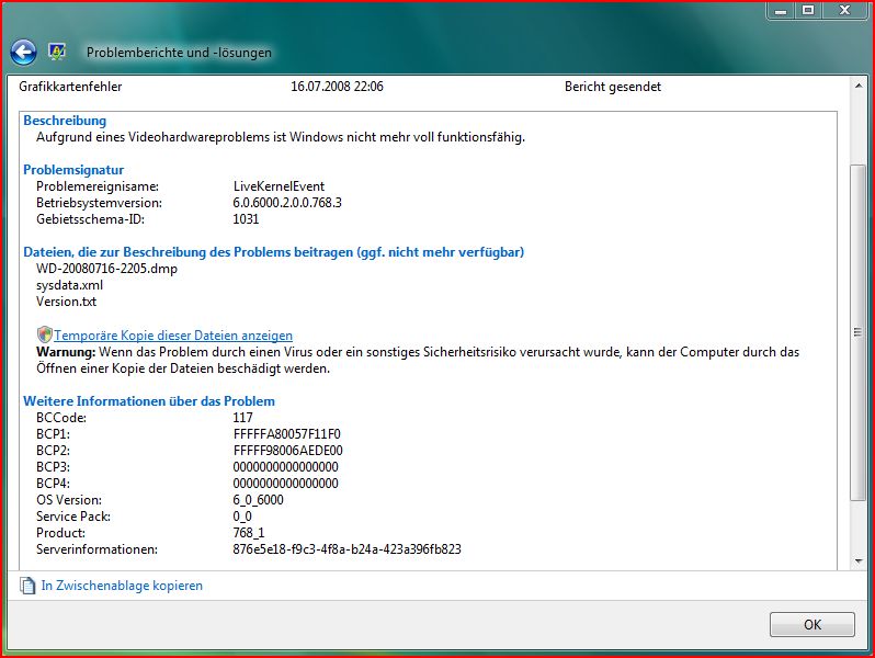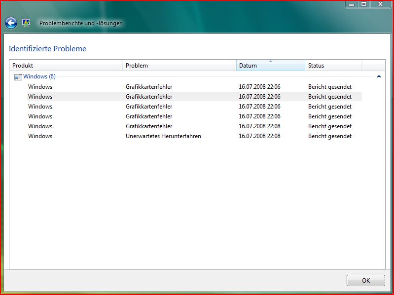 Wieder im Windows wird mir als Problemverursacher der Grafikkartentreiber genannt.