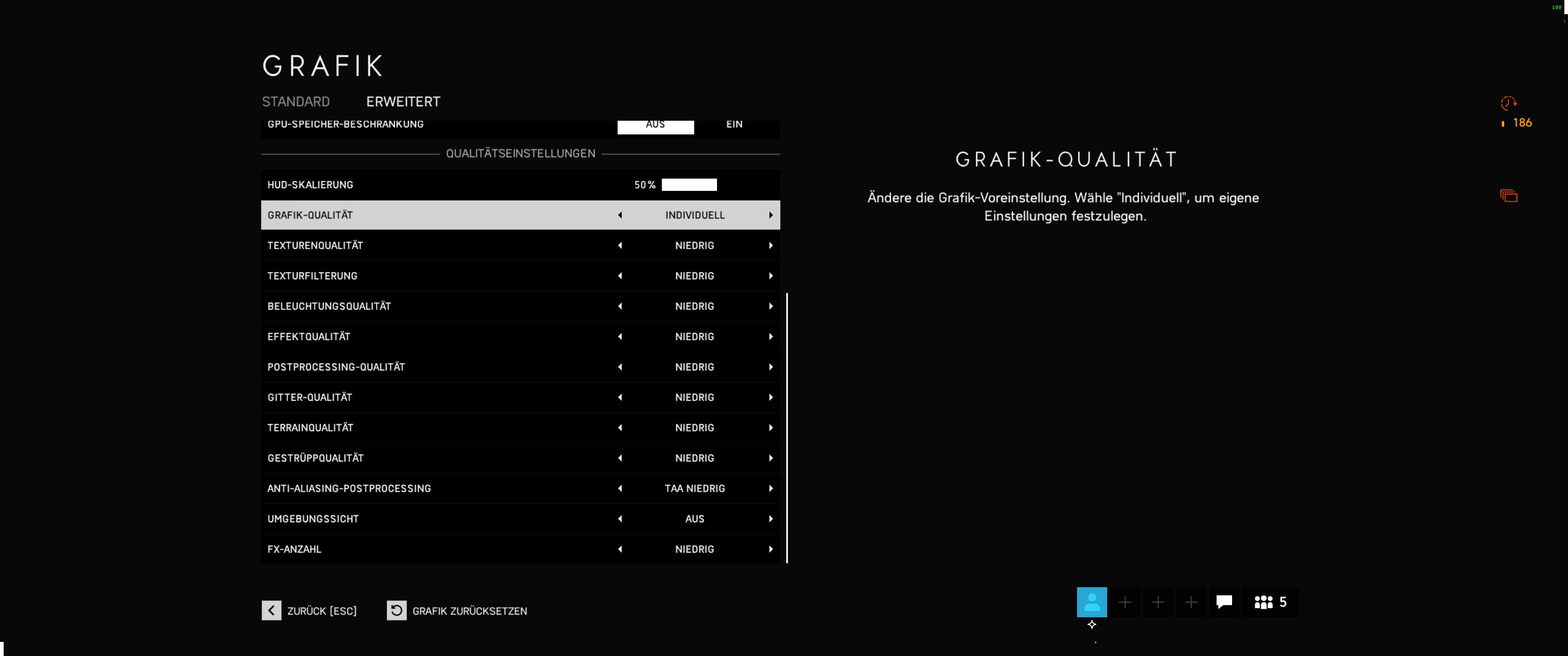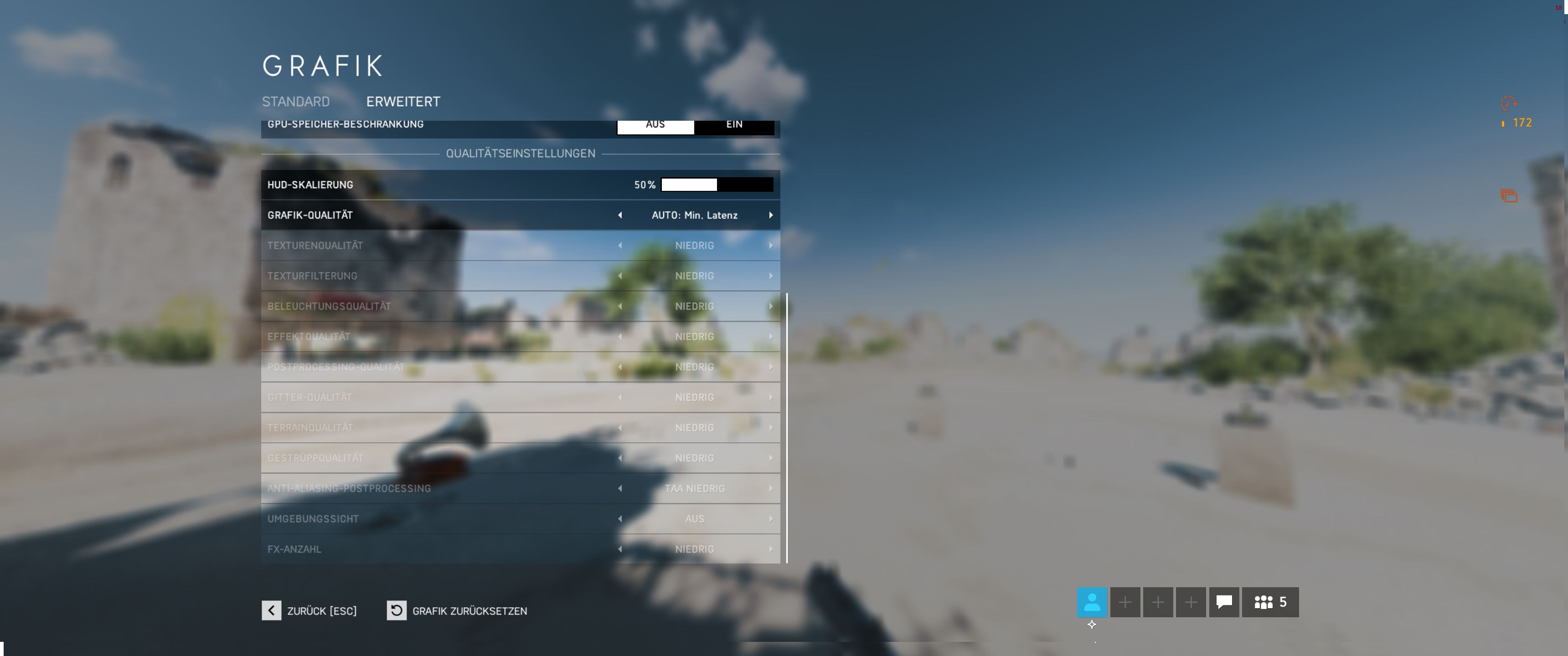 Ist ein Problem bekannt in dem BFV nur in der Grafik-Voreinstellung "Min. Latenz" gespielt werden kann. Stelle ich die Grafik auf eine andere Voreinstellung oder individual, habe ich ein schwarzes Bild. Das Menü ist normal sichtbar aber die Spiel-Grafik dahinter verschwindet. Hatte es bisher auf meine Grafikkarte geschoben, aber auch mit der neuen Vega56 besteht das Problem weiterhin.