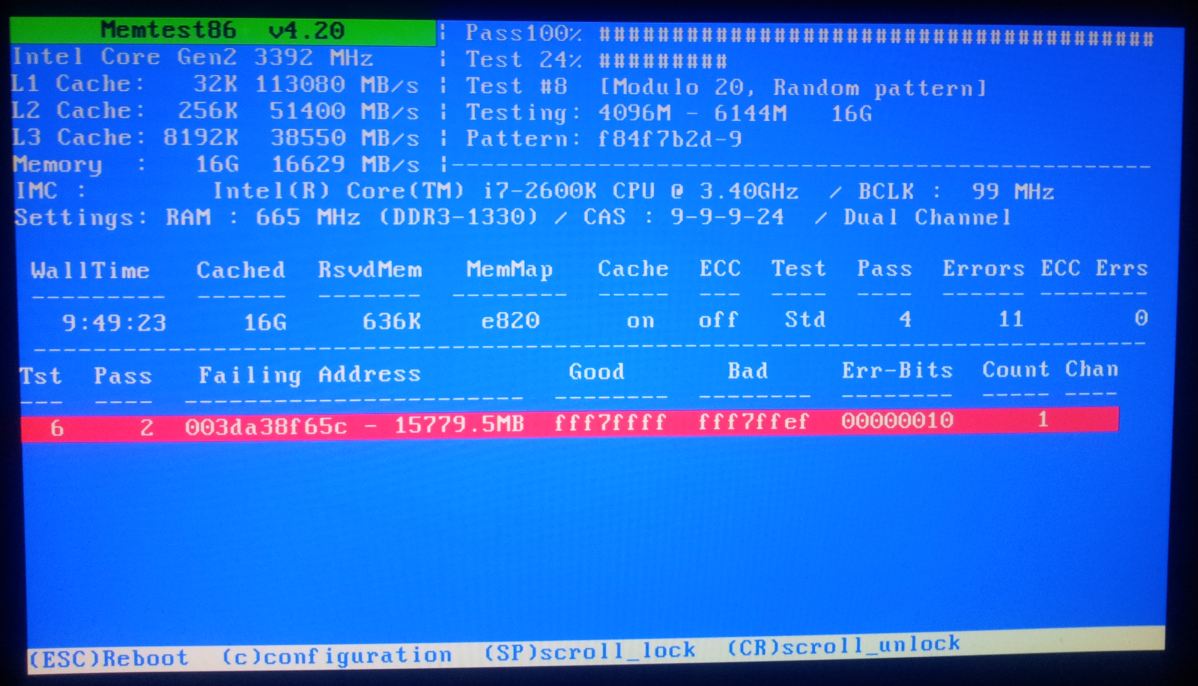Heute Nacht ist Memtest86+ nochmal durchgelaufen und hat Fehler im RAM (siehe Bild im Anhang) gefunden. Jetzt ist es die Frage: Kann der (offenbar defekte) RAM diesen Fehler überhaupt auslösen oder ist es nur ein Folgeschaden?