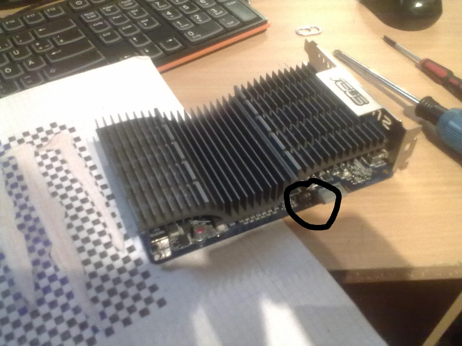 hi leute ich habe heute eine ASUS ATI Radeon EAH5570 SILENT/DI/1GD2 vom recyckler bekommen sieht auch noch sehr gut aus und wurde nicht so stark beschädigt nur is am rand bei einem kontakt http://s.gullipics.com/image/2/h/4/hq2x3b-jfamuh-1xlw/phpqgc6MY.jpeg hir in dem link ähnlich zu sehen neben dran ein kleiner bradnpunkt was mich gewundert hat weil die gpu weit weg von der stelle ist und die stelle kann eigentlich nicht heis werden