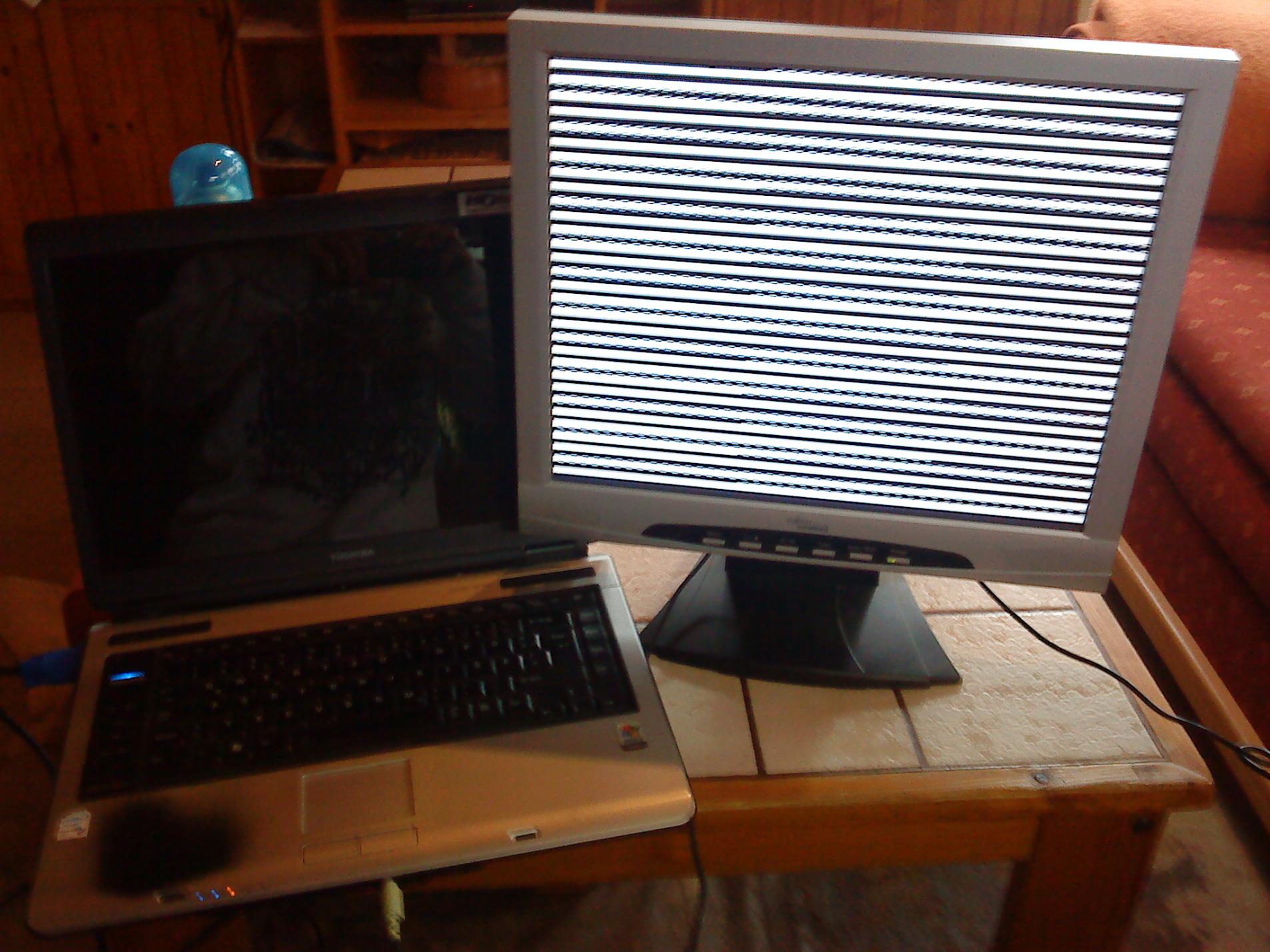 Ich habe schon einen externen Monitor angeschlossen. Dann wurde mir ein "krisselndes Bild" angezeigt.Siehe Foto.