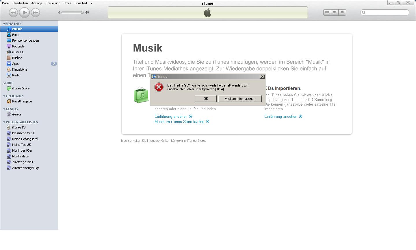 Ich habe ein großes Problem mit meinem Ipad 1. Gestern Abend habe ich es nach einigen Monaten eingeschaltet und ich habe mir eine App vom Itunes Store heruntergeladen. Die App wollte aber nicht auf Ipad rauf. Synchronisieren stand zwar auf dem Ipad, aber die App war nie auf dem Ipad drauf.