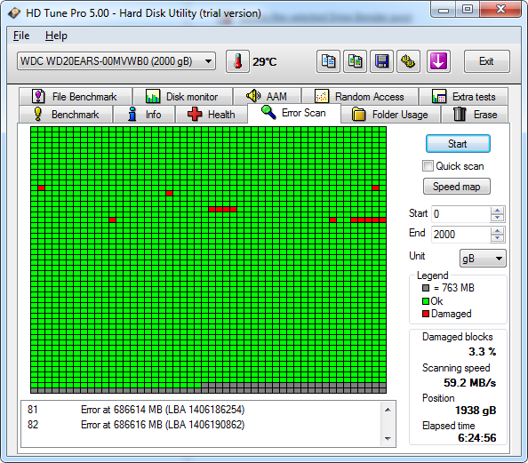 Habe mit HD Tune auch mal einen Error Scan durchführen lassen, das Ergebnis hängt an.