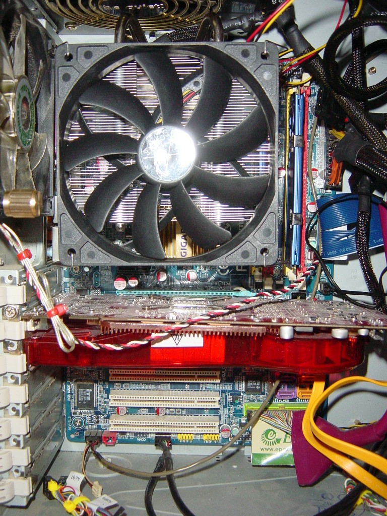 jetzt habe ich super CPU-Temperaturen, dafür ist der Rest im Gehäuse (Cooler Master Centurion 5) viel zu warm. Die Mainboard-Temperatur ist im Idle von 35°C auf 45°C (lt. Everest) angestiegen, obwohl der Lüfter des Andy die NB eigentlich mit anpusten soll. Kann man sehr schön auf dem Bild sehen, das ich gemacht habe. meine Western Digital ist jetzt immer 40°C statt wie vorher 34°C im Idle. Kann man den Andy noch irgendwie anders auf die CPU setzen? Mein 120 mm Gehäuselüfter bringt jetzt auch nix mehr, da die Luft ja nur noch auf den CPU-Kühler bläst. Leider kann ich den Gehäuselüfter nirgendwo anders einsetzen, oder geht das doch? Wäre für Tipps sehr dankbar, denn ich mache mir besonders um die NB und meine HDD große Sorgen.