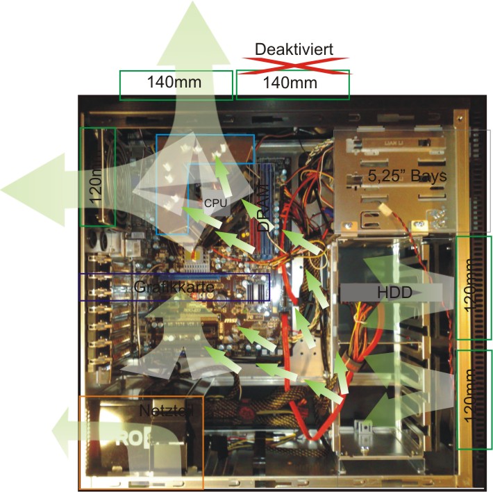 Hier ein paar Fotos für euch im passiv und aktiv Betrieb und vom Gehäuse mit Luftstrom.