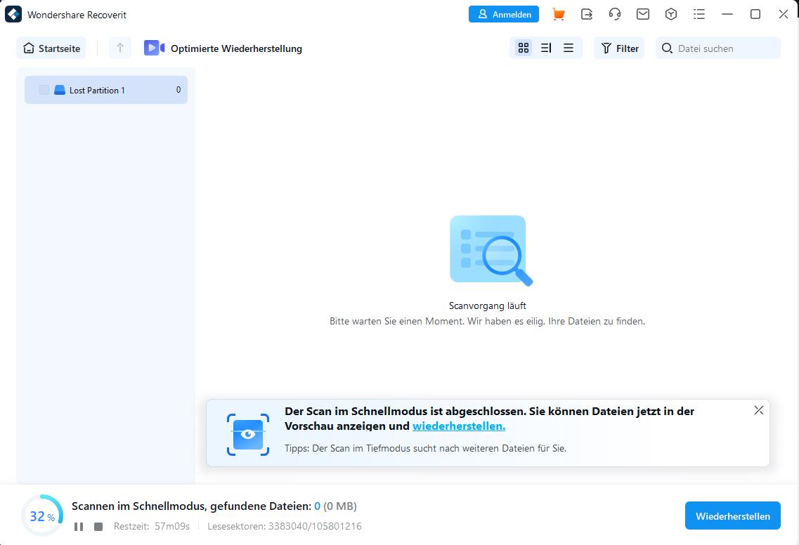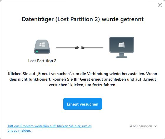 Bei Recoverit wurde eine Lost Partition erkannt s. Screenshot. Aber nach 1% Scan kam der Fehler, dass die Verbindung verloren wurde. Mit anderem Cardreader geht ein Scan, Sektoren werden durchsucht, aber nix gefunden...