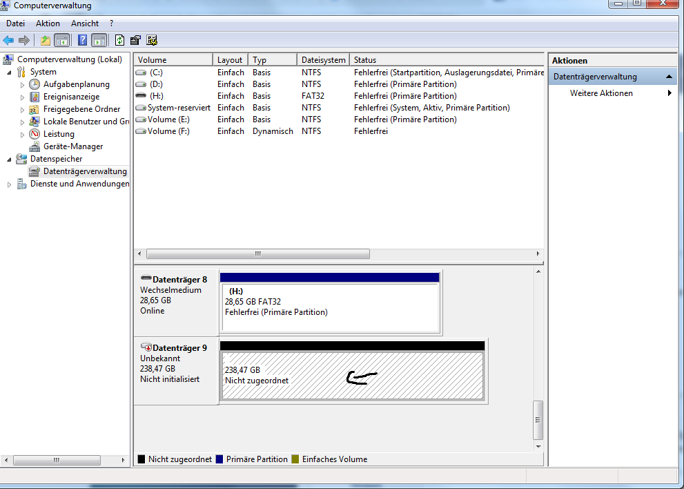 Sie wird wohl überall angezeigt, dennoch bekomme ich keine Partion erteilt und auch nicht formatiert, weder intern bzw usb.