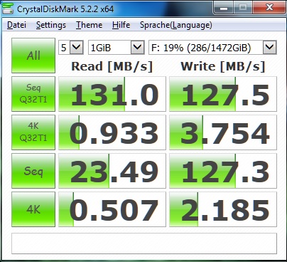 Wir haben aber nicht wenig User-Feedback, dass im laufenden Betrieb durchschnittlich Werte von 100 MB/s bis zu den maximal angegebenen 140 MB/s erreicht werden (Modell