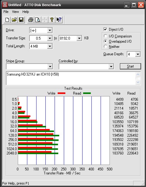 Also ATTO hat doch eh nen Bug, schaut mal was ich für Daten bekommen mit einer Samsung 321KJ. Ist kein Raid oder so... schaut euch die daten an... ATTO zeigt mir Transferraten welche über 200MB/s liegen!