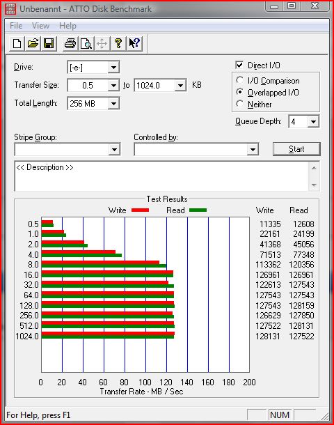 Nochmal ein Test mit ATTO, diesmal hatte die Platte nur eine große Partition und war frisch formatiert, sprich leer: