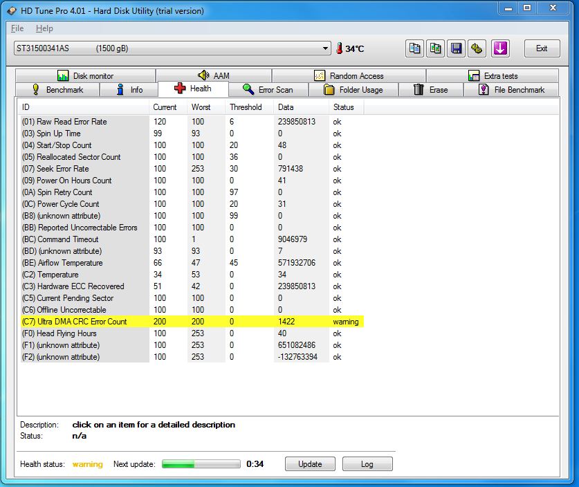 Ich habe seit Weihnachten eine Seagate Barracuda 7200.11 mit einer Kapazität von 1,5 TB in Betrieb. Ich habe mit HD Tune die S.M.A.R.T. Werte ausgelesen. Es kam ein "Warning" dabei heraus. Das kann´s bei einer neuen Platte wohl nicht sein.