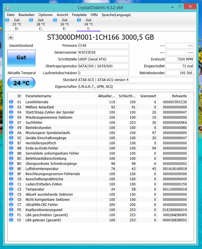 Poste bitte auch mal den Screen von CrystalDiskInfo (die Portable Standard Edition reicht und ist frei von Werbung, einfach dem Link folgen, die zip speichern und irgendwohin komplett entpacken, dann DiskInfo.exe dort starten), ziehe aber bitte das Fenster soweit auf, dass alle Attribute und auch die Rohwerte vollständig sichtbar sind.