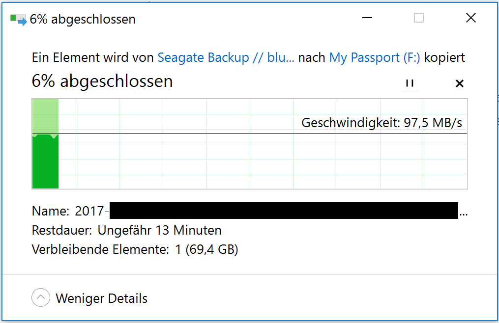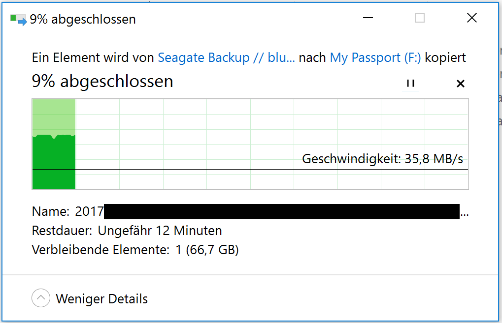 ich habe eine externe 2,5" Seagate komplett (Partition) mit TrueCrypt verschlüsselt. Darauf liegt ein 74 GB Image. Dieses wollte auf ein anderes Ziel kopieren. Immer bei 9% des Kopiervorgang geht die Übertragungsrate nach unten bzw. der Kopiervorgang hängt sich auf (s. Bild).