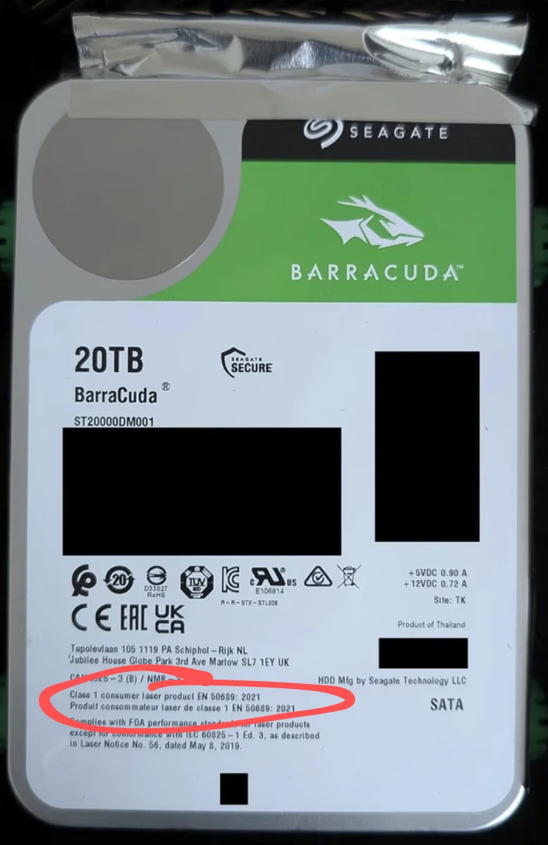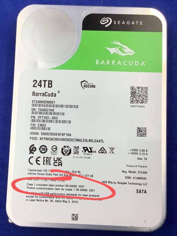 Fakt ist, dass Seagate natürlich sehr wohl 24TB Platten ohne diese "gesetzlich vorgeschriebene Sicherheitskennzeichnung" verkauft, zum Beispiel hier eine IronWolf Pro aus 2024.