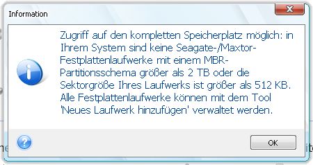 Nur sagt mir DiscWizard, daß in meinem System "keine Seagate Festplattenlaufwerke mit einem MBR-Partitionsschema größer als 2TB zu finden sind" bzw. "die Sektorgröße des Laufwerks größer als 512kb ist. Alle Festplattenlaufwerke können mit dem Tool ´Neues Laufwerk hinzufügen` verwaltet werden".