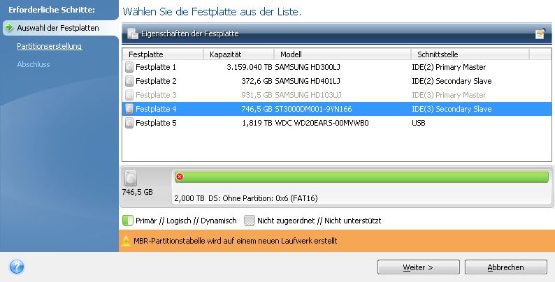 Wenn ich hier nun weitermache, erstellt mir DiscWizard wieder eine Partition mit 746,5 GB.