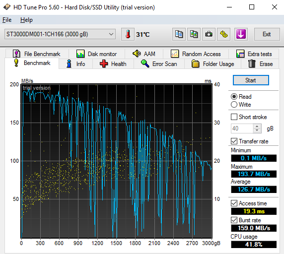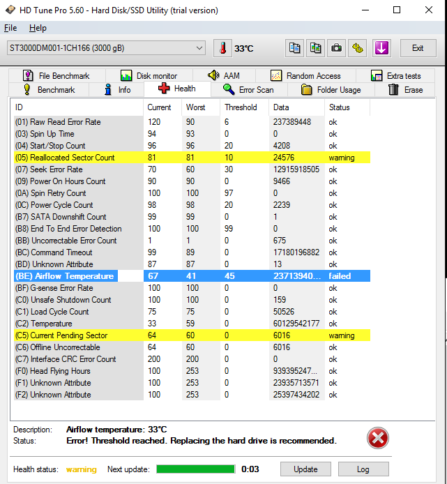 Habe nun mit dem Programm HDTune ein Benchmark gemacht (siehe Grafik) und mir den "Health" Status angesehen. Dabei ist mir die rote Warnmeldung "HDD Airflow Temperature Threshold Reached" aufgefallen. (siehe Grafik)