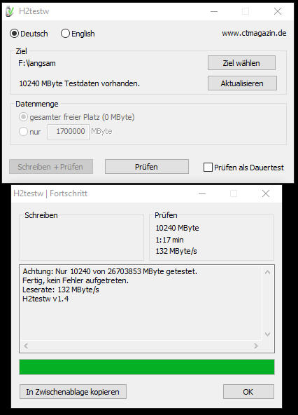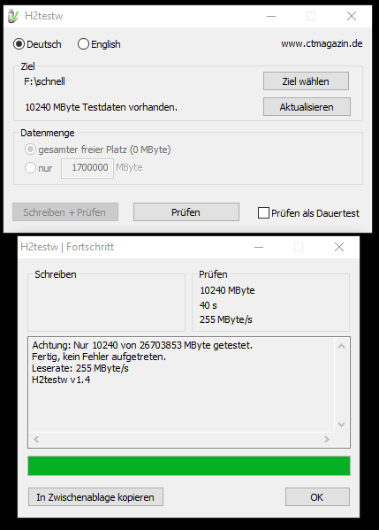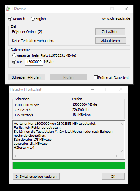 Von wegen Samstag, da bin ich ganz schön euphorisch in der Kalkulation gewesen. Das Teil hat bis heute Nacht geackert. Ich habe h2testw in 4 Schritten durchlaufen lassen mit 10TB, 15TB, 1,7TB und dann noch die restlichen 3GB, bis die Platte voll war. Ich hoffe niemand fragt sich, warum die Geschwindigkeit abnimmt, der Physiklehrer hilft aus.
